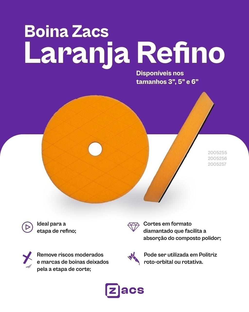 BOINA LARANJA REFINO ZACS – Desenvolvida para remoção de riscos moderados e imperfeições deixados pela etapa de corte em pintura automotiva. Elaborada para utilização na etapa de refino do polimento. Possui cortes na espuma em formato diamantado que facilita a absorção do composto polidor, garantindo um polimento uniforme.